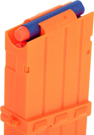 W zestawie znajduje się zdejmowany celownik dla precyzyjniejszego celowania oraz magazynek na 12 piankowych strzałek, który szybko wyjmiesz przyciskiem z boku. W opakowaniu znajdziesz 20 strzałek (10 klasycznych i 10 z przyssawką), więc możesz zacząć strzelać od razu po rozpakowaniu.