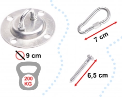 Kompletny zestaw z hakiem, śrubami, łańcuchem i karabińczykami ułatwia instalację. Odpowiedni do montażu w drewnie i betonie (przy użyciu odpowiednich kołków rozporowych).