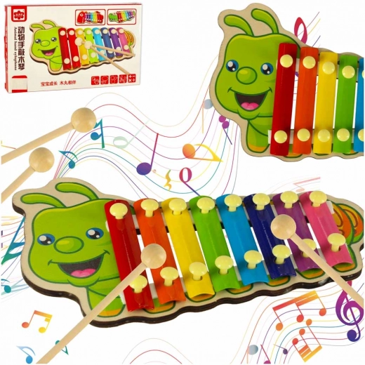 Wesoły dziecięcy ksylofon w kształcie gąsienicy z ośmioma metalowymi płytkami na drewnianej podstawie rozwija słuch, poczucie rytmu i koordynację. W zestawie są 2 drewniane pałeczki, dzięki którym dzieci łatwo zagrają pierwsze melodie i jednocześnie poznają kolory dzięki tęczowemu zabarwieniu klawiszy.