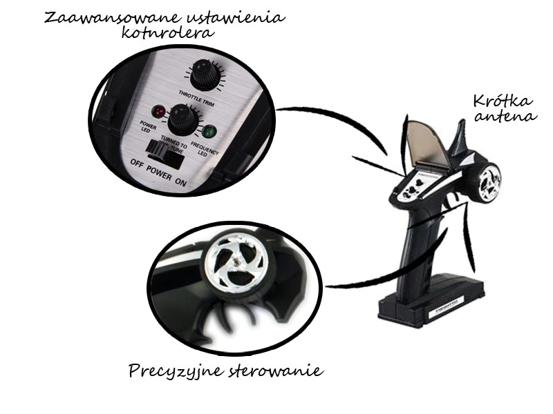Ergonomiczny kontroler pistoletowy z precyzyjnym serwem kierunku zapewnia stabilną kontrolę bez zakłóceń oraz zasięg do 150 metrów.