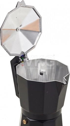Zawór bezpieczeństwa w dolnym naczyniu zwiększa bezpieczeństwo użytkowania, a ergonomiczny, odporny na ciepło uchwyt ułatwia obsługę i chroni przed oparzeniem. Kawiarka składa się z trzech części: dolnego pojemnika na wodę, metalowego sitka na zmieloną kawę oraz górnego zbiornika na gotowy napój.