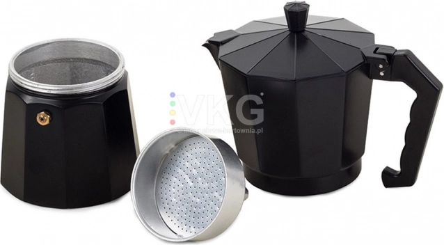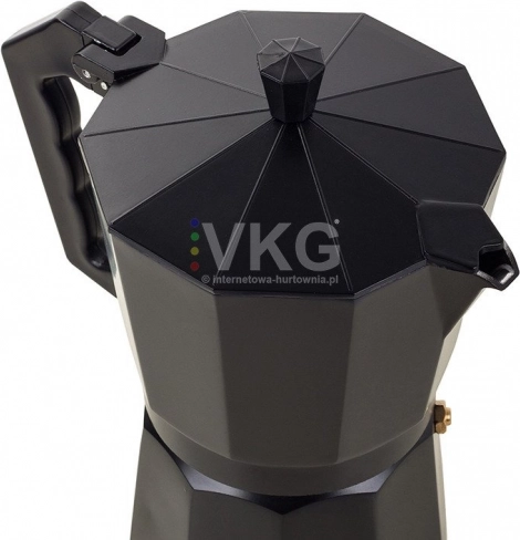 Tradycyjna kawiarka moka w nowoczesnym czarnym wydaniu łączy ponadczasowy design z praktycznymi funkcjami dla perfekcyjnego domowego espresso. Korpus z aluminium jest lekki, świetnie przewodzi ciepło i zapewnia szybkie przygotowanie ulubionej kawy w około 5 minut.