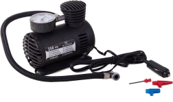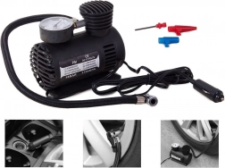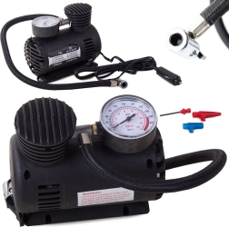Zestaw zawiera kompresor z wężem, wtyczkę do zapalniczki, manometr oraz zestaw końcówek do różnych zastosowań.
