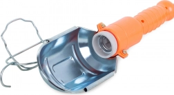 Metalowy kosz ochronny z wbudowanym reflektorem chroni żarówkę i zapewnia szerszy, bardziej ukierunkowany strumień światła. Solidna plastikowa rękojeść z wbudowanym wyłącznikiem ułatwia obsługę nawet w rękawicach.