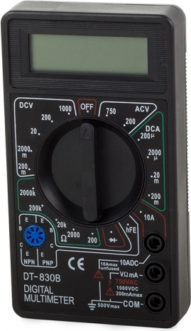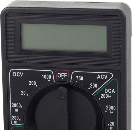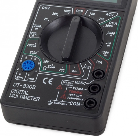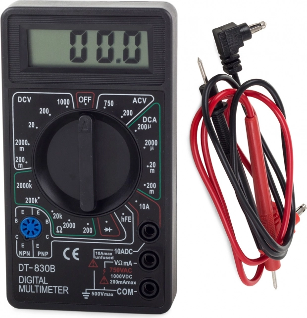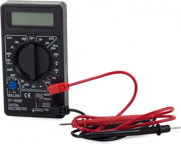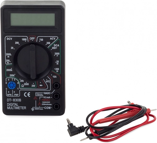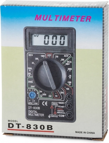 - Zawartość opakowania: cyfrowy multimetr, przewody pomiarowe, bateria 9 V 6F22, oryginalne opakowanie