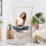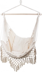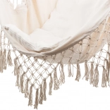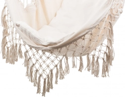 Brzeg z makramy i dekoracyjne frędzle podkreślają boho wygląd, który świetnie współgra z roślinami i naturalnymi dodatkami. Dzięki jednopunktowemu zawieszeniu fotel łatwo przymocujesz do haka sufitowego lub stojaka. W zestawie znajdują się 2 miękkie poduszki dla jeszcze większego komfortu podczas czytania i relaksu.