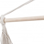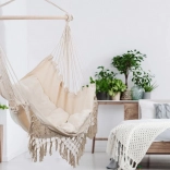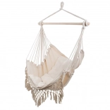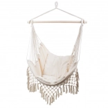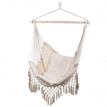 Ciesz się doskonałym relaksem w eleganckim stylu boho. Ten wiszący fotel hamakowy z frędzlami makramowymi, drewnianą belką rozpierającą i dwoma miękkimi poduszkami zapewnia maksymalny komfort, stabilną konstrukcję oraz łatwy, jednopunktowy montaż w domu i na zewnątrz.