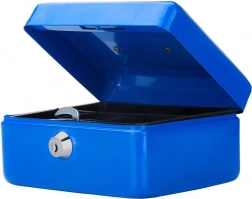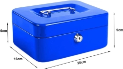 Praktyczna metalowa kasetka do bezpiecznego przechowywania gotówki, monet oraz drobnych dokumentów. Oferuje zamek na klucz (w zestawie 2 klucze), wyjmowaną wkładkę z 5 przegródkami, solidną blachę stalową oraz kompaktowe wymiary 20 × 16 × 9 cm z wpuszczanym uchwytem ułatwiającym przenoszenie i układanie w stos.