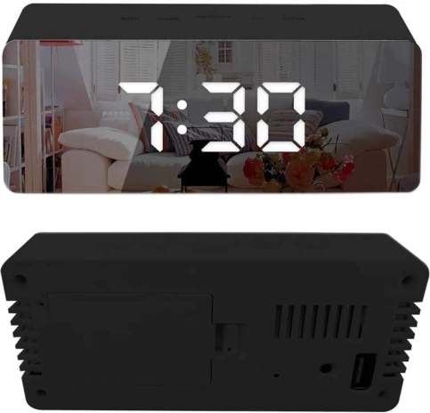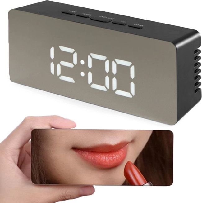 Stylowy budzik LED łączy praktyczne funkcje z nowoczesnym wyglądem. Lustrzana powierzchnia wyświetlacza pozwala szybko skontrolować wygląd, a jasność można regulować tak, aby w nocy nie przeszkadzał, a w dzień był doskonale czytelny. Czytelny ekran LCD pokazuje czas w formacie 12/24 h, datę oraz temperaturę w °C lub °F.