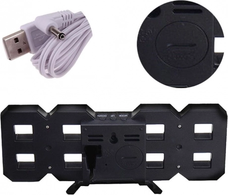 Nowoczesny budzik LED z termometrem, kalendarzem i alarmem. Duży wyświetlacz, 3 poziomy jasności, zasilanie USB, montaż na stole i ścianie. Wymiary 23,3 × 9 cm.