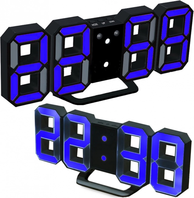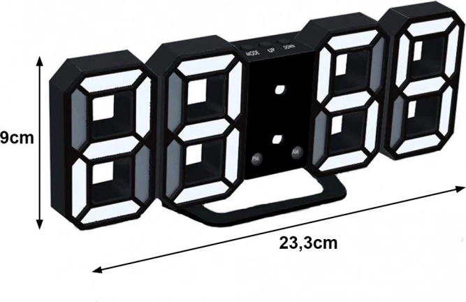 Nowoczesny LED-owy budzik z dużym, czytelnym wyświetlaczem i funkcjami zegar, kalendarz, termometr, alarm oraz snooze. Oferuje trzy poziomy jasności, możliwość zawieszenia na ścianie lub postawienia na stole oraz praktyczne zasilanie przez USB. Idealny do sypialni, salonu i biura.