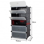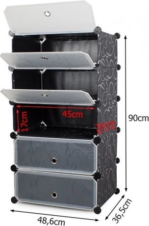 Szafka na buty posiada 5 półek, które można elastycznie piętrować lub ustawić obok siebie, w zależności od przestrzeni i potrzeb. Konstrukcja jest lekka i stabilna, co ułatwia przenoszenie i montaż. Dzięki przezroczystym okienkom łatwo i szybko znajdziesz to, czego szukasz. Materiał szafki jest wodoodporny i można go bez problemu czyścić.