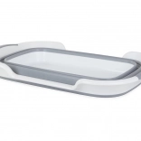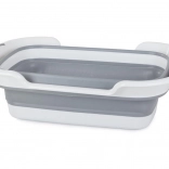 Praktyczna silikonowa składana misa z odpływem, odpowiednia do prania, sprzątania i kempingu. Dzięki wysokości po złożeniu jedynie 7,5 cm oszczędza miejsce, oferuje pojemność ok. 40 l, odpływ z nieprzepuszczalnym korkiem oraz antypoślizgowe uchwyty i nóżki z wytrzymałego tworzywa sztucznego i silikonu.