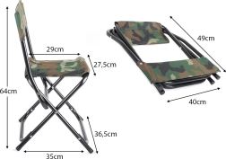 Wygodne siedzenie uzupełnia oparcie pleców oraz wytrzymała tkanina w wzorze camo, zapewniające przyjemne spędzanie czasu nad wodą lub przy ognisku.