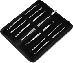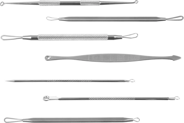 Ten praktyczny zestaw zawiera 7 dwustronnych narzędzi do komedonów (łącznie 14 końcówek roboczych) do delikatnego i precyzyjnego oczyszczania skóry. Większe pętle pomagają przy pryszczach i zaskórnikach zamkniętych, mniejsze pętle i szpiczaste końcówki są idealne na zaskórniki otwarte w trudno dostępnych miejscach. Stal nierdzewna jest trwała, higieniczna i łatwa do sterylizacji.