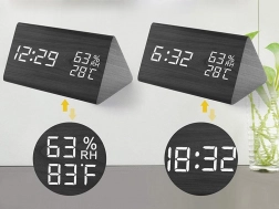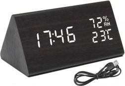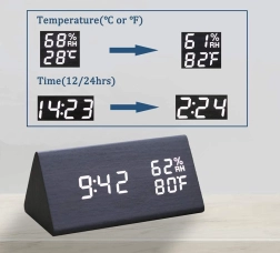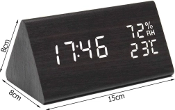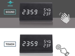 Designerski zegar stołowy z efektem czarnego drewna świetnie pasuje do sypialni, salonu i biura. Wielofunkcyjny wyświetlacz pokazuje czas, datę, temperaturę (°C/°F) oraz wilgotność. Dzięki sterowaniu dźwiękiem wyświetlacz w trybie oszczędnym rozświetla się po klaśnięciu lub stuknięciu, co jest szczególnie wygodne w nocy.