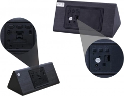 Do wyboru są 3 poziomy jasności (100%, 50%, 2%), tryb 12/24 h oraz do 3 niezależnych alarmów z wskaźnikiem aktywacji. Urządzenie można zasilać kablem USB (w zestawie) lub 4× bateriami AAA (brak w zestawie). Minimalistyczny klinowy kształt i czyste linie podkreślają nowoczesny wygląd wnętrza.
