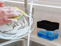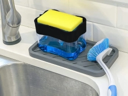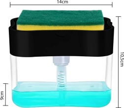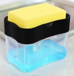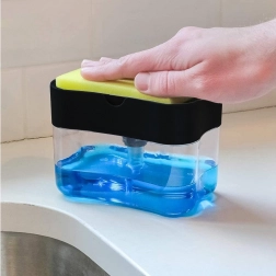 Utrzymuj kuchnię i łazienkę w porządku dzięki sprytnemu dozownikowi, który łączy zbiornik na mydło w płynie lub detergent z praktycznym uchwytem na gąbkę. Jednym naciśnięciem gąbki otrzymasz dokładnie tyle środka, ile potrzebujesz – bez marnowania i bez kropel wokół zlewu.