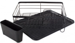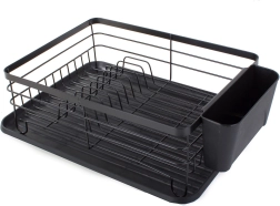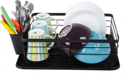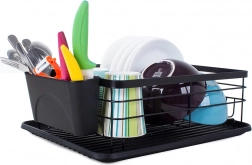 Utrzymaj kuchnię czystą i uporządkowaną dzięki ociekaczowi do naczyń z przestronnym zbiornikiem. Stabilna metalowa konstrukcja z malowaniem proszkowym jest odporna na uszkodzenia i wilgoć, a plastikowa tacka ociekowa zatrzymuje wodę i chroni blat roboczy. W zestawie znajduje się także wieszany uchwyt na sztućce, który możesz umieścić na dowolnej krawędzi suszarki.