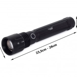Dzięki funkcji zoom można płynnie zmieniać ogniskową światła i uzyskać zasięg do 1000 metrów. Do zasilania użyto wysokiej jakości akumulatorów litowo-jonowych 26650, które wydłużają czas pracy. Latarka oferuje kilka trybów świecenia: 100%, 75%, 50%, stroboskop i SOS.