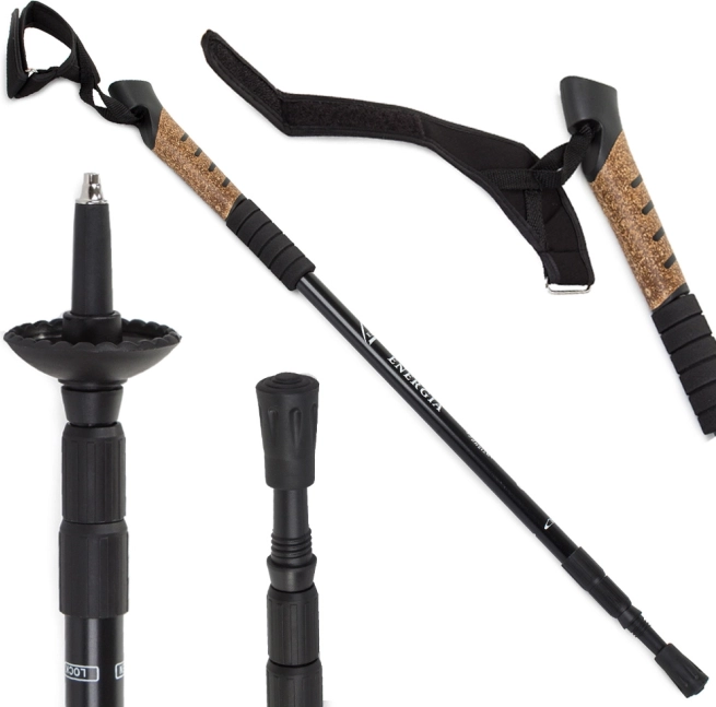 Lekki i wytrzymały kij do nordic walking z korkową rękojeścią dla naturalnego chwytu i wygody. Dzięki systemowi ANTI-shock odciąża stawy, ma 3 sekcje dla łatwej regulacji do 135 cm, a w zestawie znajdziesz 3 rodzaje nakładek na asfalt, śnieg i piasek.