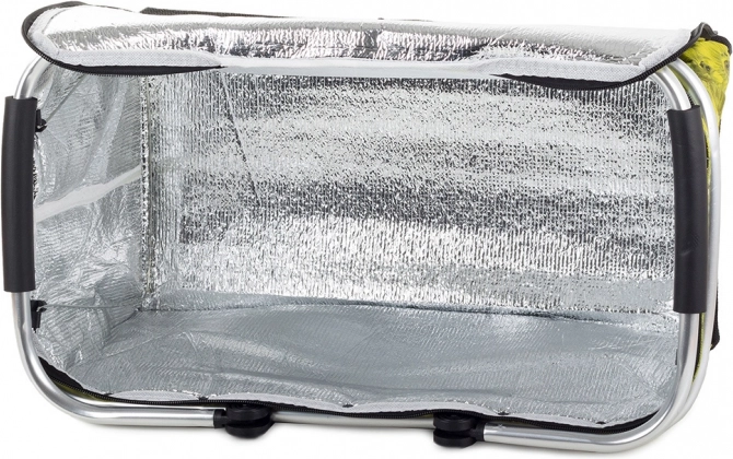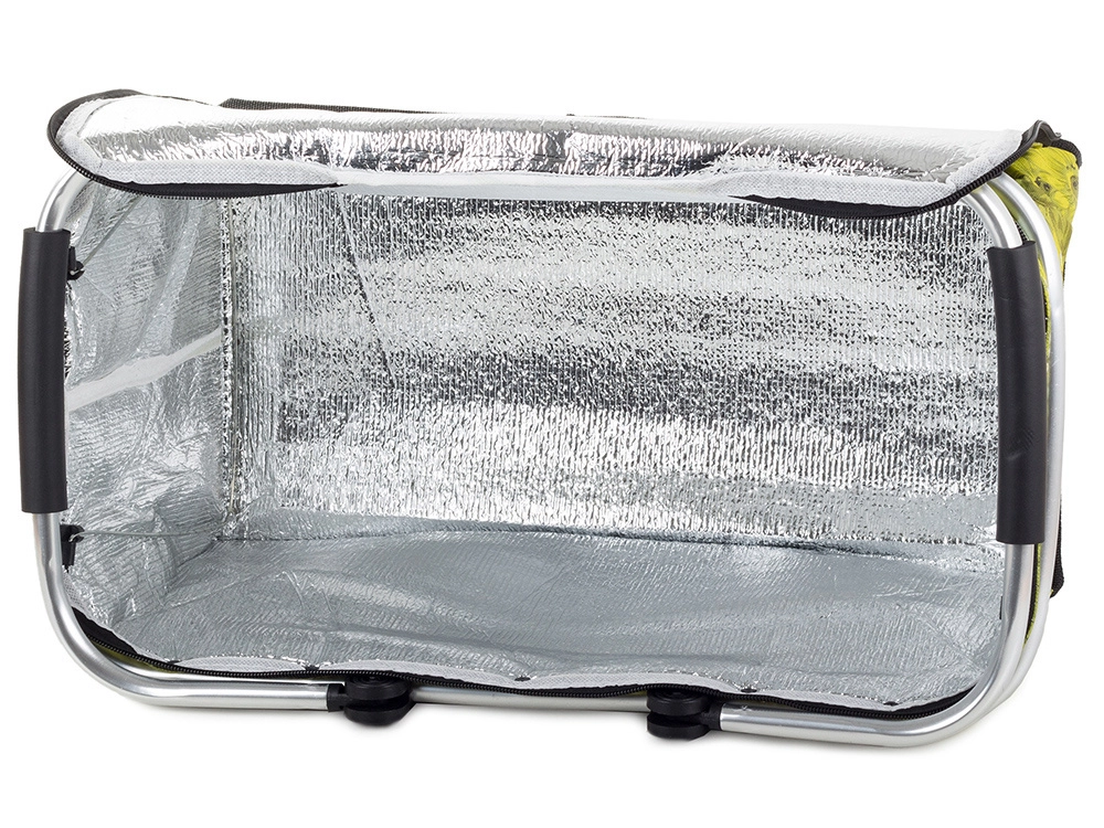 Praktyczny i stylowy kosz termoizolacyjny na pikniki, plażę i zakupy, który dzięki wewnętrznej folii termoizolacyjnej niezawodnie utrzymuje żywność i napoje w pożądanej temperaturze. Posiada lekką aluminiową ramę, zamknięcie na zamek błyskawiczny, składane uchwyty z powłoką antypoślizgową oraz wzmocnione, podszyte dno dla stabilności. Po złożeniu zajmuje minimum miejsca.