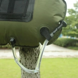 Ergonomiczny gumowy uchwyt ułatwia przenoszenie i zawieszanie. Z przodu znajduje się siateczkowa kieszeń na mydło lub szampon oraz praktyczne haczyki do zamocowania główki prysznicowej, aby zatrzymać przepływ wody bez marnowania. Po złożeniu prysznic zajmuje minimum miejsca, więc doskonale nadaje się do plecaka lub samochodu.