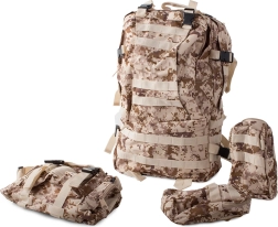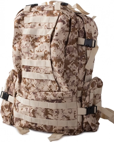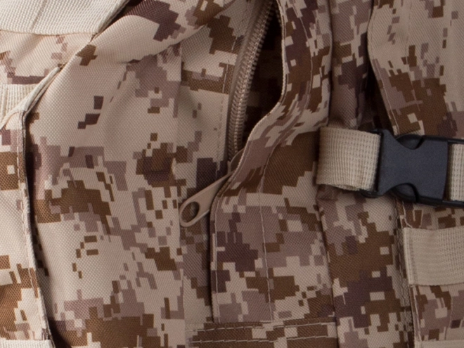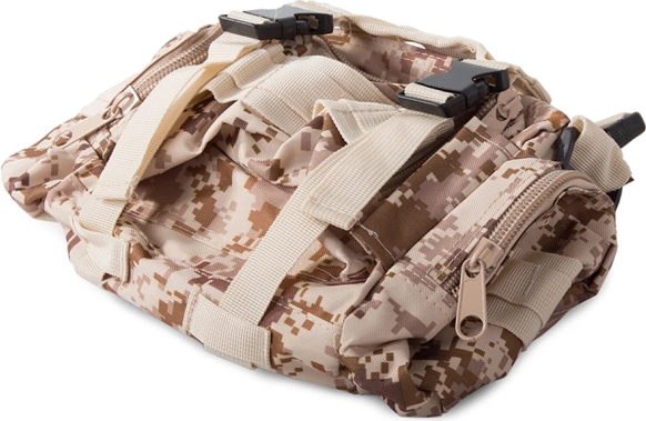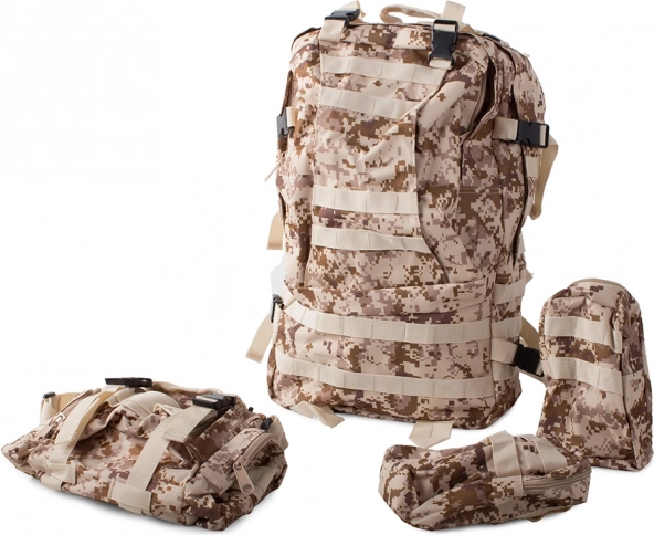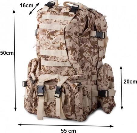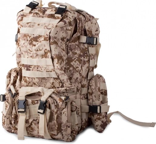 Wyrusz na każdą wyprawę bez obaw o pogodę z wodoodpornym taktycznym plecakiem. Ten plecak oferuje jedną dużą komorę główną z dodatkową przegrodą i kieszeniami z siatki dla lepszej organizacji. Dwie sakwy po bokach można łatwo odpiąć, a większą nerkę wykorzystać jako osobną torbę. Plecak korzysta z systemu MOLLE do dodawania kolejnych kieszeni i modułów oraz jest wyposażony w pas piersiowy i biodrowy dla maksymalnego komfortu i stabilności.