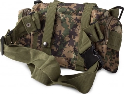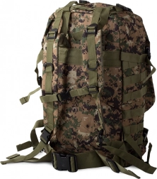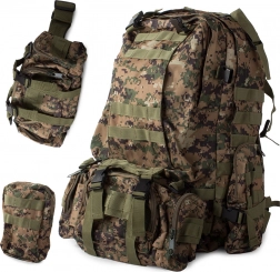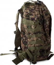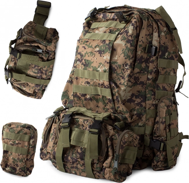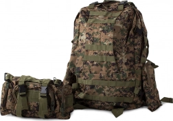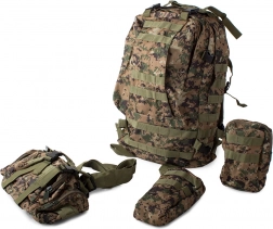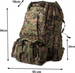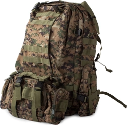 Plecak oferuje dużą główną komorę z dodatkowymi przegródkami, w tym odpinane boczne sakwy oraz odpinaną nerkę, którą można nosić osobno. System MOLLE umożliwia dodawanie kolejnych kieszeni i modułów.