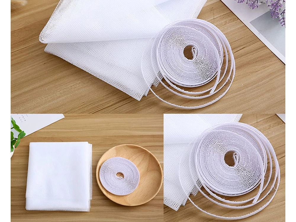 Montaż zajmuje kilka minut: przyklej rzep do ramy, przyłóż siatkę, przytnij nadmiar i gotowe. Materiał jest wytrzymały, można go prać (30 °C) i nadaje się do wielokrotnego użytku. Rozmiar 180 × 150 cm łatwo dopasujesz do większości okien oraz drzwi balkonowych.