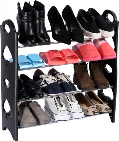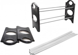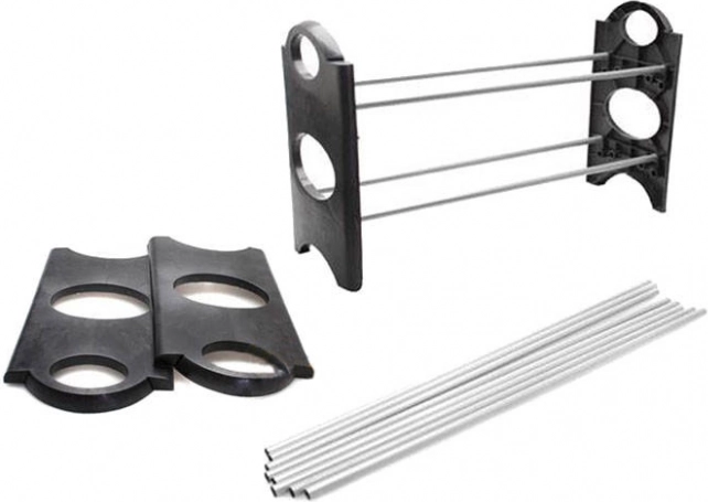 Konstrukcja segmentowa łączy metalowe (chromowane) rurki z wytrzymałymi plastikowymi słupkami. W każdej rurce znajdują się trzy otwory montażowe, dzięki czemu łatwo dostosujesz wysokość półek zarówno do szpilek, jak i tenisówek. Regał można rozszerzyć o kolejne poziomy – łącząc dwa zestawy, podwoisz pojemność. Montaż jest szybki, a po demontażu zajmuje minimum miejsca.