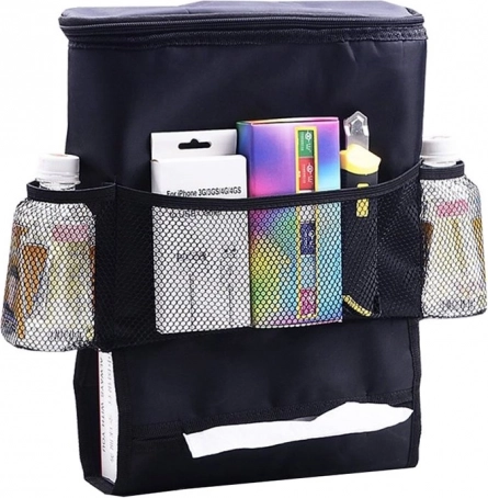 Praktyczny organizer na fotel samochodowy z torbą termoizolacyjną jest idealny dla rodzin i na codzienne dojazdy. Pomaga utrzymać porządek w aucie, mieć wszystko pod ręką, a przy tym chroni tył przedniego fotela przed brudem, wodą i błotem. Dzięki izolowanej głównej kieszeni na zamek przekąski pozostają świeże, a napoje w pożądanej temperaturze.