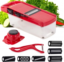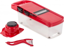 Czerwony plastikowy komponent i przeźroczysty pojemnik umożliwiają łatwe użycie oraz kontrolę ilości przetwarzanych warzyw.
