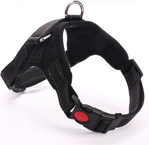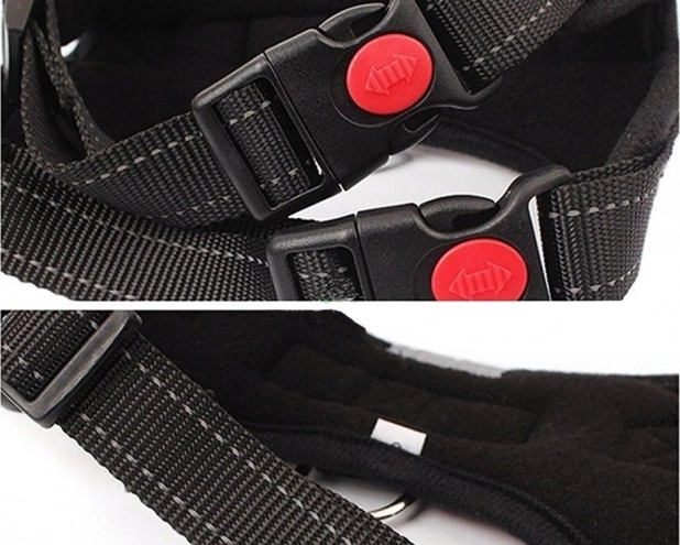 Solidny metalowy D-ring do smyczy, praktyczny górny uchwyt oraz klamry z zabezpieczeniem przed przypadkowym odpięciem zapewniają pewne prowadzenie psa w każdych warunkach.