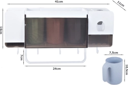 Utrzymaj łazienkę w idealnym porządku dzięki temu ściennemu organizerowi na szczoteczki do zębów i kubki z wbudowanym dozownikiem pasty. Oferuje praktyczne przegródki na kosmetyki, 3 kubki o pojemności 300 ml, haczyki na szczoteczki oraz łatwy montaż na ścianie za pomocą przyssawki. Stabilna konstrukcja o udźwigu do 5 kg i zintegrowany uchwyt na ręczniki zapewniają porządek i oszczędność miejsca.