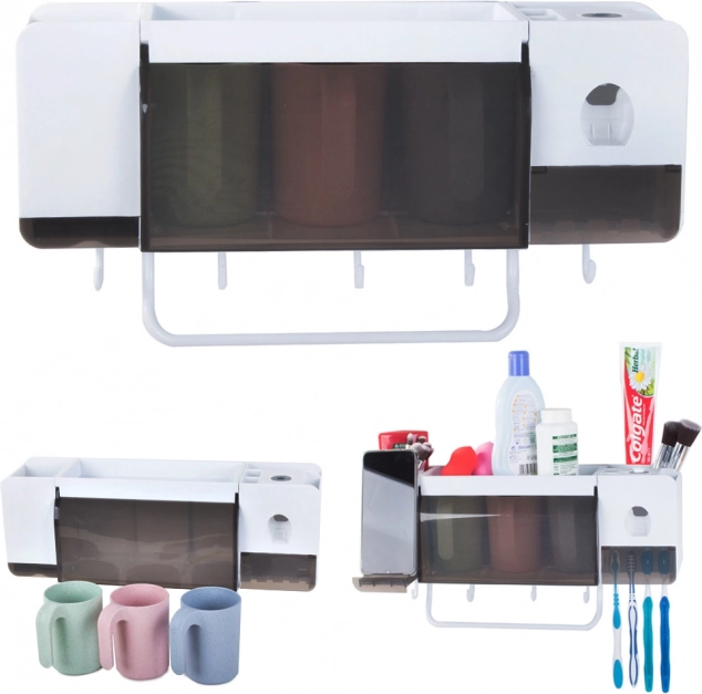 Sprytny organizer do łazienki łączy miejsce na szczoteczki, pastę i kosmetyki w jednym, kompaktowym module. Automatyczny dozownik pasty do zębów ułatwia codzienną higienę, a przegródki na akcesoria mieszczą kremy, pędzle do makijażu czy dezodoranty. Trzy wytrzymałe plastikowe kubki (300 ml) są idealne dla całej rodziny.