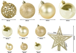 W zestawie znajdziesz ozdoby o średnicach od 30 mm do 60 mm oraz jedną gwiazdę Betlejemską o wymiarach 13,5 cm x 14 cm. Wszystkie są pakowane w estetyczną walizkę, która umożliwia łatwe przechowywanie.