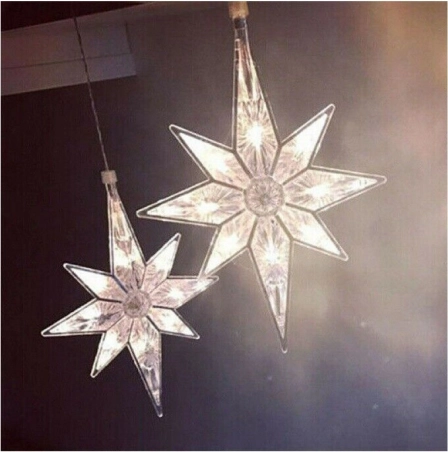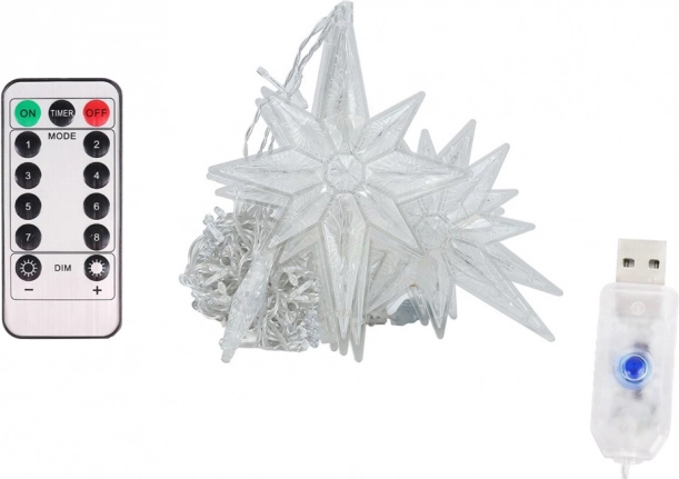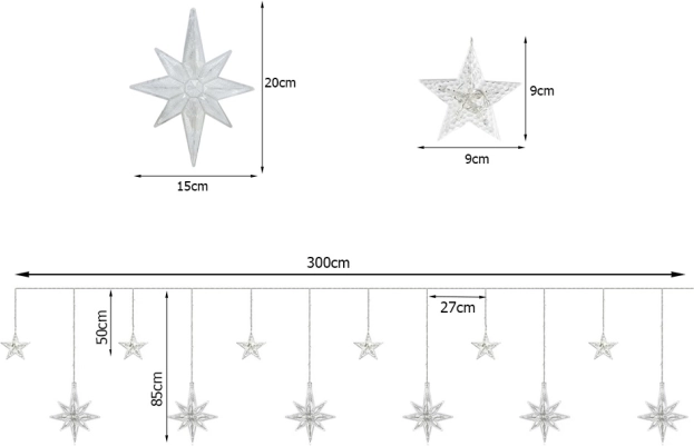 Zasłona zawiera 6 dużych gwiazd i 6 mniejszych gwiazd, o łącznej długości 5 m. Możesz wybierać spośród 8 różnych programów świetlnych dla stworzenia pożądanej atmosfery za pomocą załączonego pilota zdalnego sterowania.