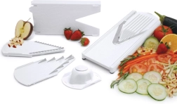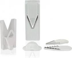 Ta krajalnica do warzyw i owoców został zaprojektowany do łatwego i szybkiego przygotowywania produktów spożywczych. Można go używać do krojenia frytek, tarcia czekolady lub szatkowania kapusty. Wyposażony jest w różne ostrza do różnych kształtów, co czyni go uniwersalnym narzędziem w Twojej kuchni.