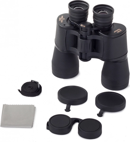 Lornetkę można podłączyć do adaptera do statywu dla wygodnej długiej obserwacji. Zawiera również pokrywki chroniące okulary i obiektywy, ściereczkę czyszczącą oraz solidne etui z paskiem na ramię.
