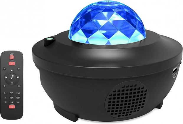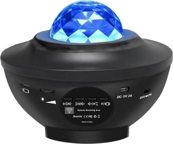 Urządzenie ma wbudowany głośnik Bluetooth (obsługa także pamięci USB), więc łatwo połączysz światło z muzyką. Za pomocą pilota przełączysz tryby, utwory i ustawisz timer na 1–2 godziny. Projektor można postawić lub zawiesić na ścianie/suficie, a dzięki gumowym, antypoślizgowym nóżkom stabilnie stoi na meblach.