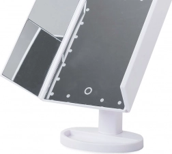 Eleganckie, potrójne lusterko kosmetyczne z podświetleniem LED zapewnia jasny, równomierny obraz bez cieni. Główny panel otoczony 22 diodami LED ułatwia precyzyjny makijaż, stylizację brwi czy golenie. Dotykowy włącznik na froncie umożliwia szybkie uruchamianie i wygodne sterowanie.