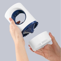 Wyjmowany pojemnik na zanieczyszczenia umożliwia szybkie i higieniczne czyszczenie bez bezpośredniego kontaktu z owadami. Zasilanie USB zapewnia elastyczność ustawienia – wystarczy powerbank, adapter lub port USB. Elegancki design w kolorze białym i ciemnoniebieskim pasuje do każdego wnętrza.