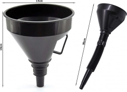 Duży lejek z filtrem wykonany jest z plastikowych materiałów odpornych na chemikalia, co zapewnia długą żywotność i niezawodność. Dzięki dwuczęściowej konstrukcji można używać samodzielnie lub w połączeniu z elastycznym uchwytem, co ułatwia precyzyjne wlewanie.