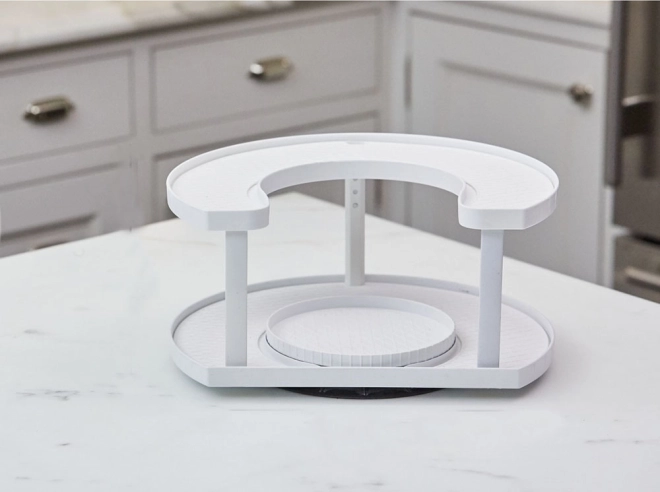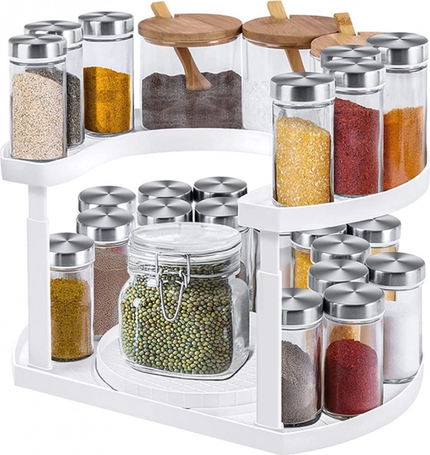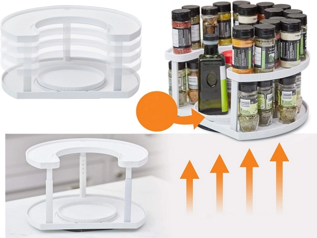 Utrzymuj porządek w kuchni dzięki praktycznemu, dwupoziomowemu organizerowi na przyprawy z płynnym obrotem o 360°. Zapewnia szybki dostęp do wszystkich słoiczków, regulowaną wysokość oraz uniwersalne zastosowanie w kuchni, łazience i na toaletce.