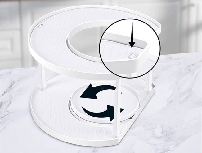Obrotowy mechanizm pozwala szybko znaleźć i wyjąć potrzebne przyprawy lub kosmetyki bez przekładania całej półki.