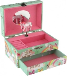 Ta stylowa pozytywka–szkatułka z jednorożcem jest idealna do przechowywania pierścionków, kolczyków i małych sekretów. Po otwarciu wieczka z lusterkiem, po nakręceniu kluczyka, biało‑różowy jednorożec zaczyna się obracać, a w tle rozbrzmiewa delikatna muzyka. Wnętrze oferuje podział na biżuterię, a dolna szufladka pomieści dodatkowe drobiazgi.