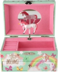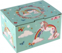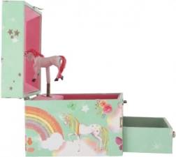 Po nakręceniu kluczyka i otwarciu wieczka figurka jednorożca zaczyna się obracać, a subtelna melodia potęguje magiczny nastrój podczas odkładania biżuterii.