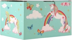 Solidny karton z metalowym zapięciem i zawiasami gwarantuje długą żywotność. Pastelowozielone motywy tęczy, gwiazdek i motyli pięknie ozdobią każdy dziecięcy pokój.