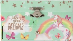 Pastelowozieloną powierzchnię zdobią motywy tęczy, gwiazdek i motyli. Szkatułka wykonana jest z mocnego kartonu, uzupełniona metalowym zapięciem i wytrzymałymi zawiasami dla dłuższej trwałości. Doskonały prezent do dziecięcego pokoju – piękny i jednocześnie praktyczny.